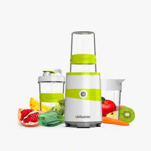 1000W motor unit with rubber part and a single button to start the extraction process and develop 18000 rotations per minute. Duration of continuous use max 2mn. Supplied with 2 mugs (70cl with rubber part and 50cl), “ready to go” sport cap and conservation cap, 2 blade units (extraction and milling), a pitcher handle, 1000W motor unit, a user manual and a recipe book dedicated.
